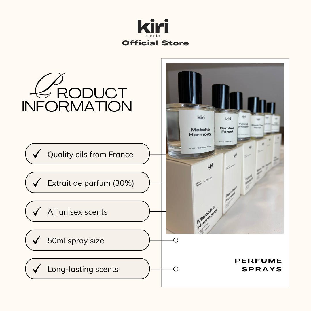 Discover Kiri's Bamboo Forest fragrance spray, a 50ml perfume spray inspired by the serene beauty of bamboo groves and the purity of white tea. Infused with 100% premium fragrance oils from France, this scent combines the crisp, green freshness of bamboo with delicate tea and woody undertones, creating a revitalizing aroma that transports you to a tranquil sanctuary.